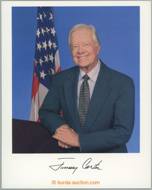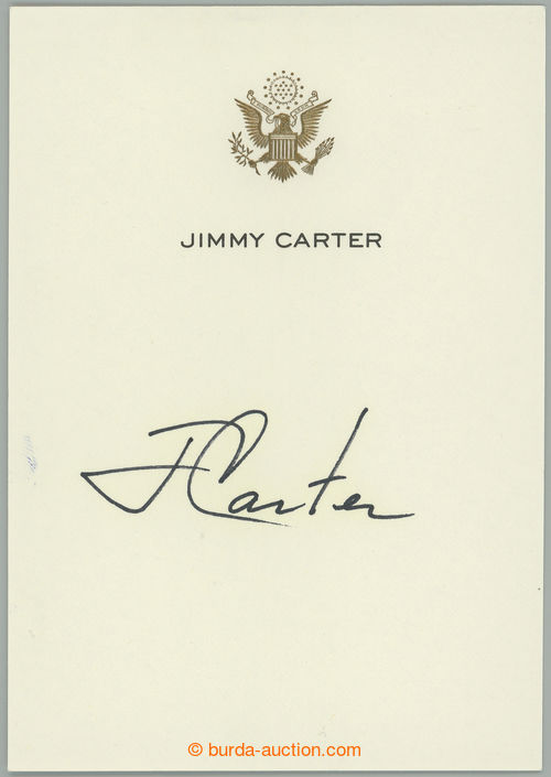 Autographs. CARTER Jimmy (1924-2024), American demokraticky politician, 39. president Spojenych states American, autograph on paper slip with golden emblem USA, supplemented with about/by portrait photograph with printed signature;