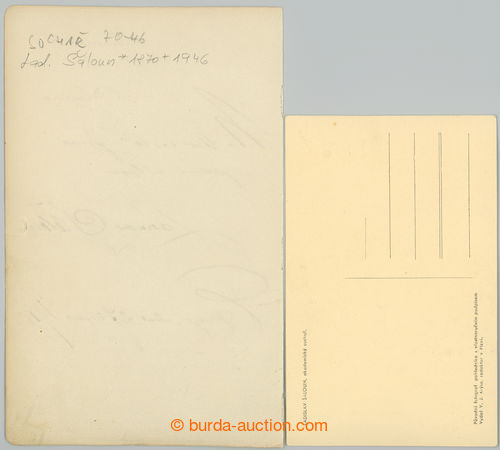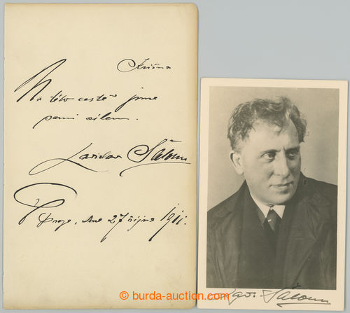 Autographs. SALOUN Ladislav (1870-1946), Czech sculptor, author sculpture master John Huss on/for Staromestskem square, autograph on portrait photograph + signature with pripisem and dataci on card from monument; very fine (Image) (Image2)