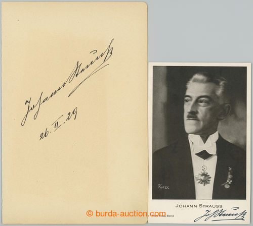 Autographs. STRAUSS Johann (1866-1939), Austrian composer, autograph on portrait postcard + signature with dataci on card from monument; very fine