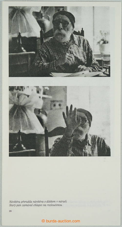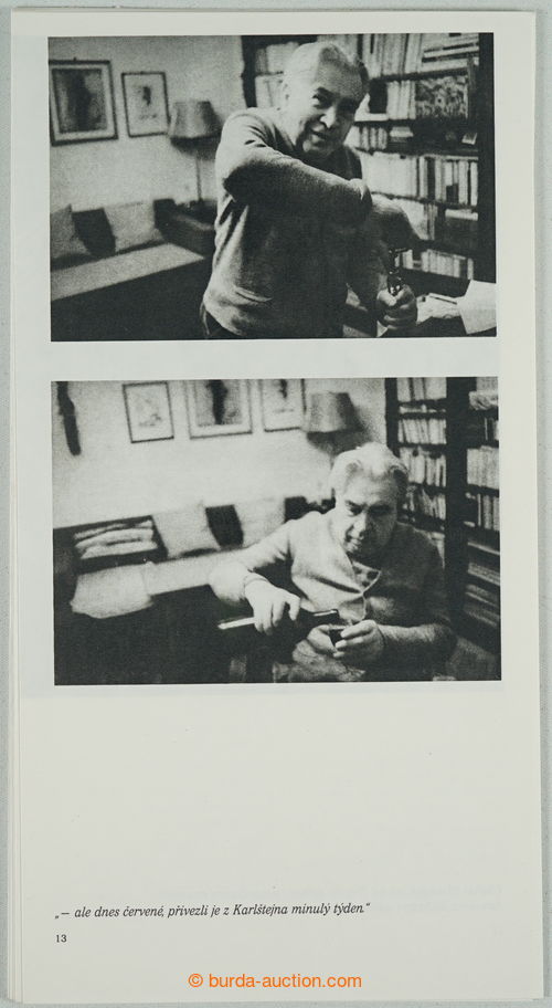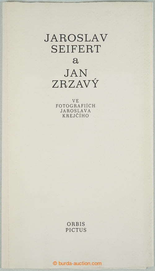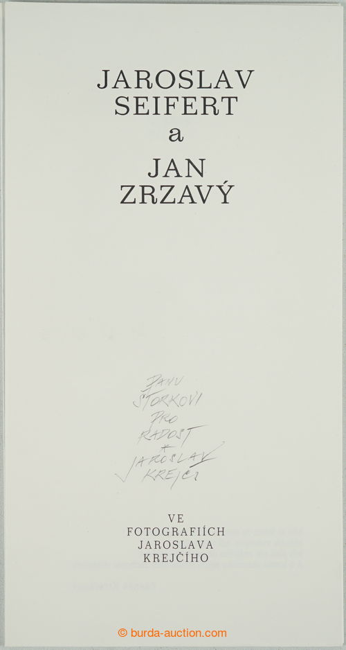 Autographs. KREJCI Jaroslav (1929-2006), Czech graphic artist, illustrator, theatre photographer and vysokoskolsky pedagogue, autograph with dedication in/at author publication photos Jaroslav Seifert and John Zrzavy; very fine,