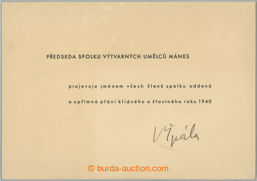 Autographs. SPALA Wenceslas (1885-1946), important Czech painter, graphic artist and illustrator, autograph on wish club/association Manes to New Year 1940; good condition (Image)