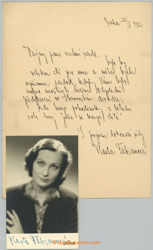 Autographs. FABIANOVA Vlasta (1912-1991), important Czech actress, handwritten pages letter + portrait photo postcard with signature from film Rukavicka, atelier Strominger; perfect condition, decorative (Image) (Image2)