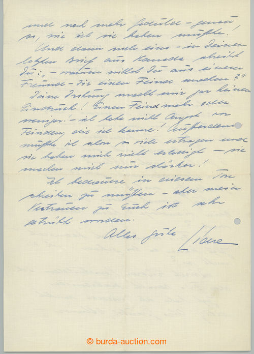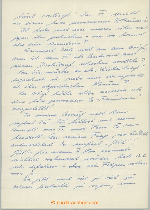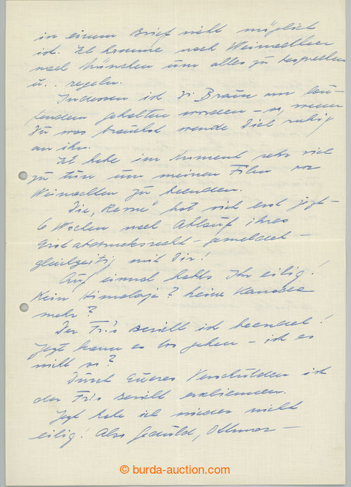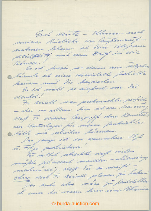Autographs. BAAROVA Lida (1914-2000), one of nejslavnejsich Czech herecek, handwritten German written 4-page letter Ottmaru Katzovi, mnichovskemu novinari and redaktorovi with signature Lida; 2x hole after/around perforator,