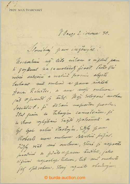 Autographs. SVABINSKY Max (1873-1962), Czech painter and illustrator, handwritten 2-page letter with signature on/for heading paper; nice good condition (Image) (Image2)