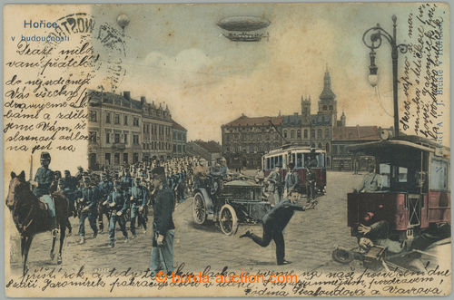 Picture Postcards. HORICE - in/at future, collage, Zeppelin, tram, cars, marching soldiers in the square, coloured seriography, issued J. Biciste, long address, Us; toned, text in margins (Image) (Image2)
