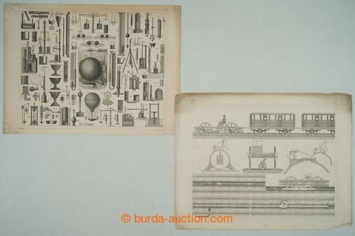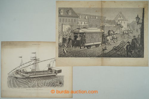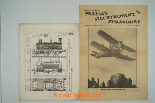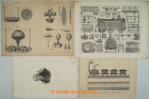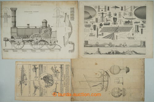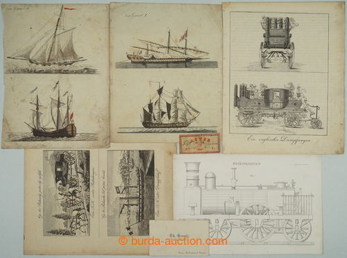 Historical Documents, Maps. [COLLECTIONS] SHIPS / VZDUCHOPLAVBA / RAILWAYS / AUTOMOBILISMUS / selection of various contemporary documents in relation to dejinam transport, i.a. historical gravure ship, balloons, engines, old