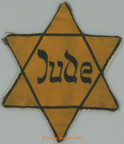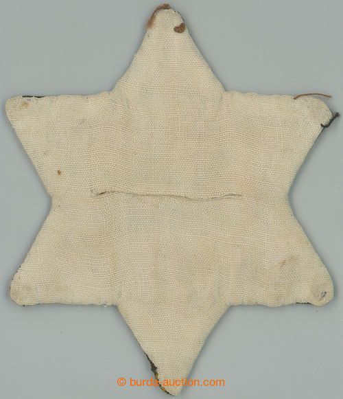 3513 imageOther Collector`s Domains. JEWISH BADGE / used original nasivka on/for odev from zluteho textilu with black printing Jude; podsita white latkou (Image) (Image2)