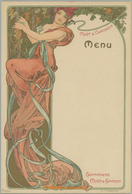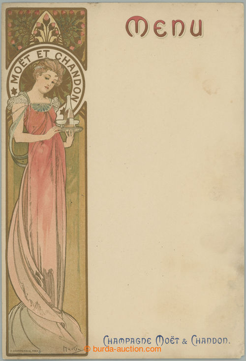 3502 imageOther Collector`s Domains. MUCHA Alfons (1860-1939), Menu Moët et Chandon, printed form/blank jidelnicku, color lithography, size 22x15cm, issued Champenois; exceptionally nice quality (Image) (Image2)