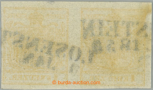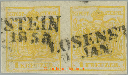 Philately. Mi.1X, HP III, Coat of arms 1 Kr yellow, horizontal pair, tissue paper, very wide margins, straight line postmark LOSENSTEIN, 2x plate variety - incomplete-printing characters U and K, for specialist interesting, cat.