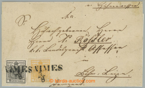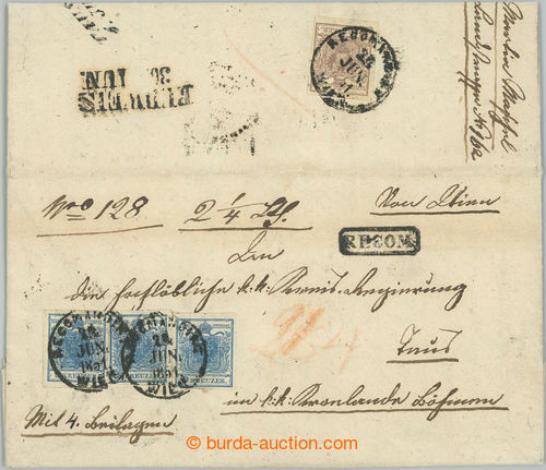 Philately. 3x heavier Reg letter from Vienna to Domazlice (Taus), with Ferch.5HIb 3x + 4HI, i. e. 3x Coat of arms 9 Kreuzer Ib type UNTERLEGTE MITTE and on reverse 6 Kreuzer Ib; VF, cat. min. 2.200EUR, illustrated in monograph W.