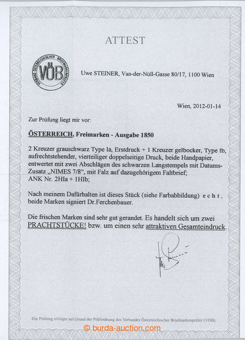 Philately. Ferch.1Ib + 2Ia, Coat of arms 1 Kr gelbocker, type Ib with rare two-sided print (4 parts) + 2 Kreuzer grey-black, type Ia (Erstdruck), both hand-made paper, both cancelled by NIEMES 7/8, mounted with hinges on original