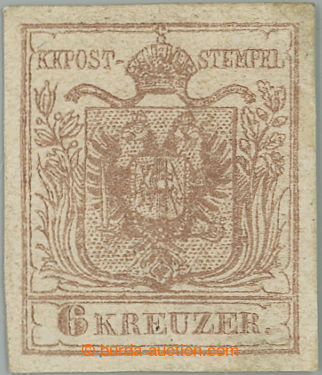 Philately. Ferch.4HIII, mint stamp Coat of arms 6 Kreuzer light brown, type III., hand-made paper; with part original gum, wide margins, exp. Sorani