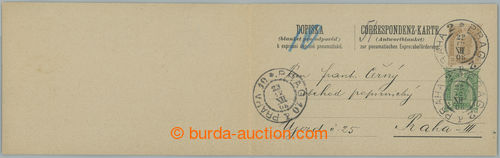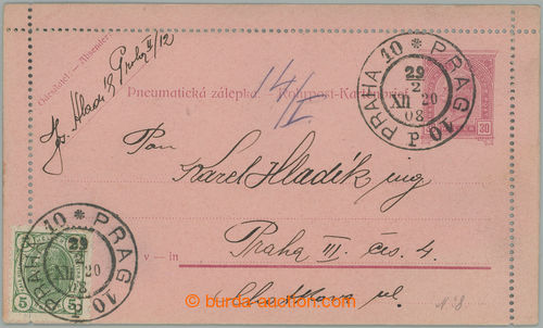 Philately. PRAGUE PNEUMATIC TUBE POST / Ferchenbauer. KB9, letter-card for Prague pneumatic-tube post 30H red issue 1904, uprated with stamp 5h issue 1906 on face-side, CDS PRAGUE 10/ 29/2 08; incl. margins, good condition, c.v..
