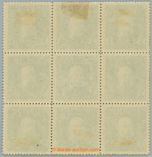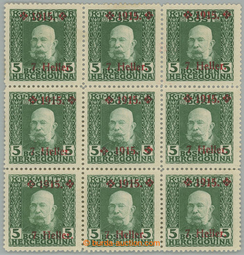 Philately. ANK.93+93F, overprint Franz Joseph I. 7H/5H green, blk-of-9, stamp in the middle with printing error 1915 instead value 7 heller; hinged, some perforation imperfections, sought (Image) (Image2)