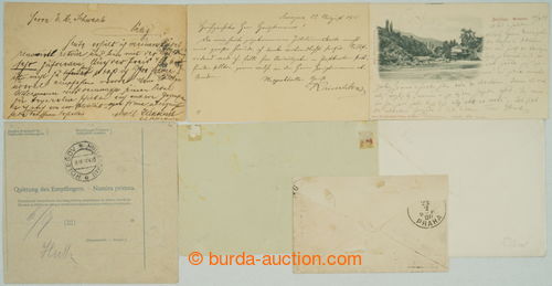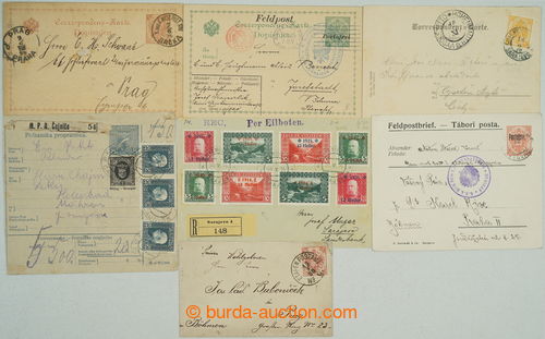 Philately. SELECTION of / 7 entires, i.a. larger part dispatch-note franked with 3x Franz Joseph I. 50H; Reg letter with issue 1918; FP card Portofrei, postcard and letter sent to Bohemia and oths.; overall sound condition (Image) (Image2)