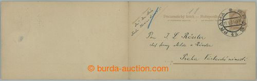 Philately. PRAGUE PNEUMATIC TUBE POST / Ferch.PK25 Prag Doppelkarte, whole double used pneumatic tube postcard Franz Joseph I. 20H+20H brown, uprated, private additional-printing of stamp 5h Franz Joseph the first issue 1908, CDS