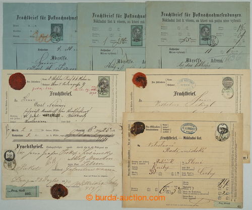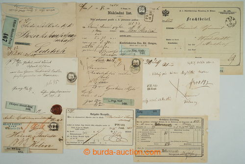 Philately. REVENUES / FREIGHT LETTERS FOR RAILROAD - FRACHTBRIEF / 14 freight letters for railroad with additionally printed or mounted revenue issue 1854 - 1910, various postmarks, supplemented with other blank form as Wedding