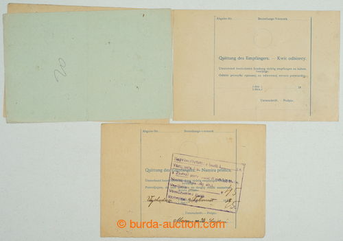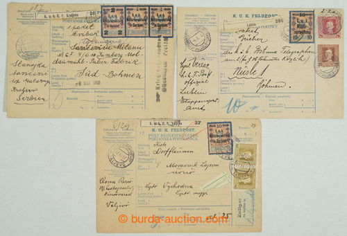 Philately. MILITARY REVENUE STAMPS / selection of 3 complete dispatch notes K.u.K. Feldpost addressed to Bohemia with mounted fiscal revenues of issue 1912 with overprint 10h K.u.K. MILITARVERWALTUNG IN SERBIA and K.u.K.