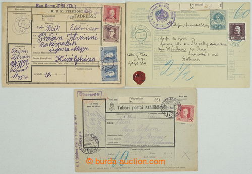 Philately. 3 complete dispatch notes K.u.K. Feldpost with field post franking Franz Joseph I. and Charles, CDS FP 339, FP 457 and TP 172; good condition (Image) (Image2)