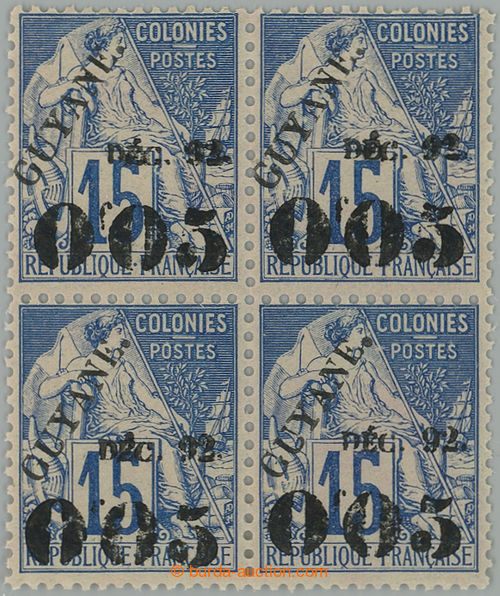 Philately. Yv.29, overprint Allegory 0.005/15C blue, block of four, mint never hinged; c.v.. 820EUR+ (Image) (Image2)