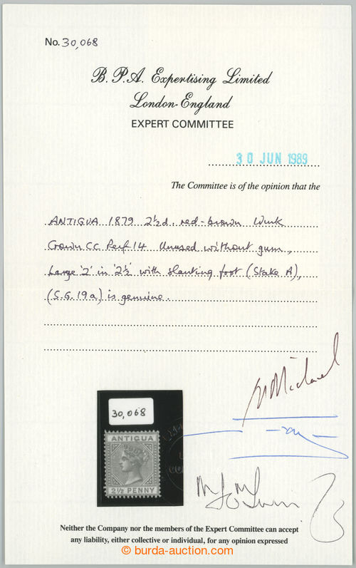 Philately. SG.19a, Victoria 2½P red-brown wmk CC, with printing error SLANTING FOOT OF 2; without gum, fine and extremely rare stamp, with BPA certificate, c.v.. £11.000, important rarity (Image) (Image2)