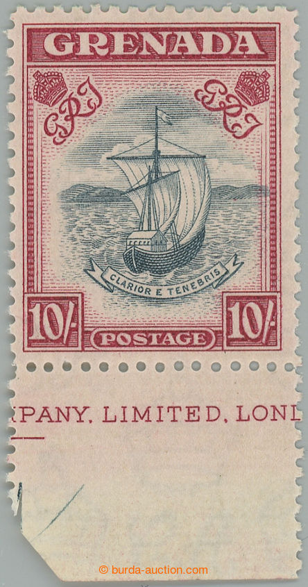 Philately. SG.163c, Coat of arms 10Sh, rare perforation 12, bottom marginal stamp with part of inscription in margin; mint never hinged, c.v.. £750++ (Image) (Image2)