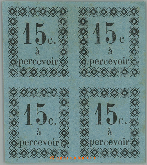 Philately. Yv.4, Postage due stamp 15C as blk-of-4, stamp at Righr top with plate variety - without stop after c; very fine with large part original gum, exp. Scheller (Image) (Image2)