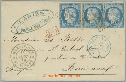 Philately. letter to Bordeaux, franked with 3x colonial issue Ceres 25C blue, CDS MARTINIQUE 11.AUT.74 and additional cancel., on reverse transit and arrival postmarks.; very fine (Image) (Image2)