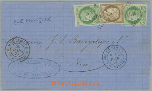 Philately. letter to Nice, with colonial issue Ceres 5c (2x) and 30C, CDS MARTINIQUE 29.MARS.77, additional cancel., on reverse transit and arrival postmarks.; very fine (Image) (Image2)