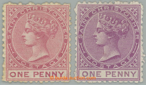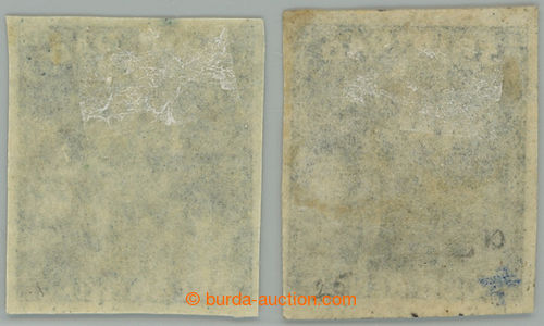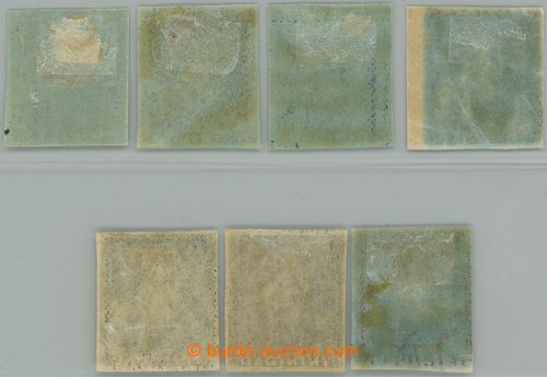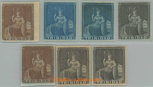 Philately. SG.2-5, 7, 9, 10, Sitting Britannia (Perkins-Bacon) 1P in various colors, blue paper - purple brown, blue, deep blue, grey, brownish red; white paper - deep purple, dark grey; fine set, c.v.. £750 (Image) (Image2)