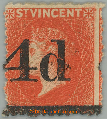 Philately. SG.35, Victoria 1Sh (Perkins Bacon) with overprint 4P; very fine example with irregular perf, c.v.. £1.600, rare stamp ex P. Jaffe, with mark STANLEY GIBBONS (Image) (Image2)