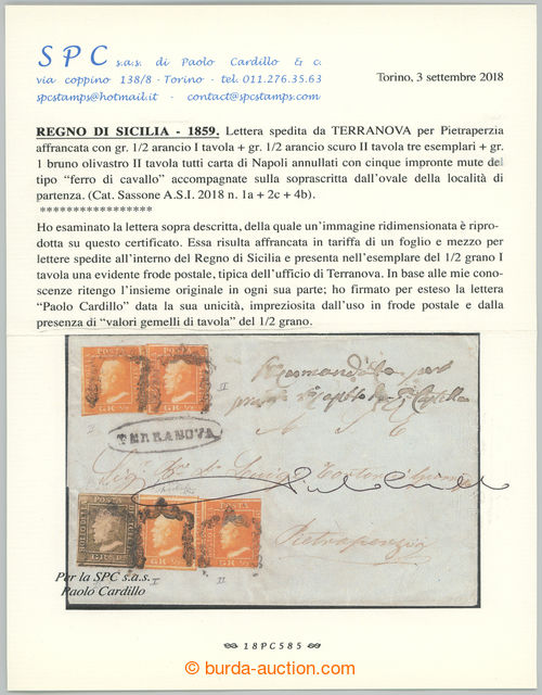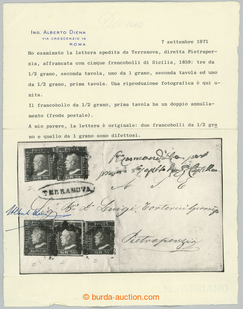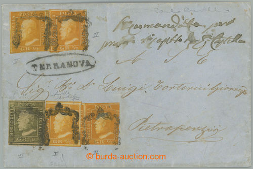 Philately. letter to Pietraperzia with 1x Ferdinand II. ½Gr orange (1. plate), 1x 1Gr and 3x 1Gr orange from rare plate 2 (II. tavola) (!), Sass.1a+2c (3x)+4b, cancel. TERRANOVA; very fine classic letter, scarce, certificates Diena