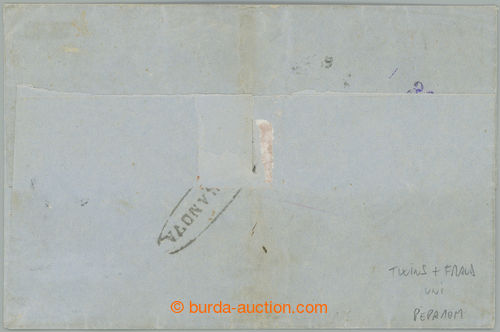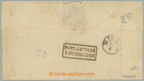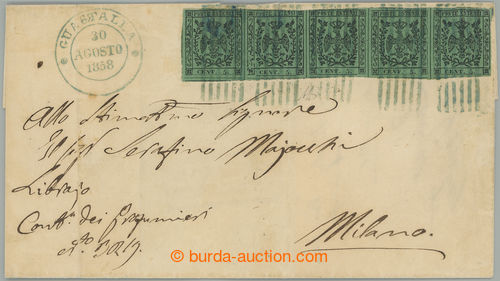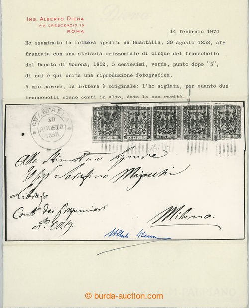 Philately. Sass.7, Coat of arms 5c green, horiz. STRIP OF 5 (!) on letter to Milan, cancelled by dumb line cancel, also CDS GUASTALLA 30.AGOSTO 1858, on reverse arrival MILAN; certificate Alberto Diena, c.v.. 55.000EUR, scarce