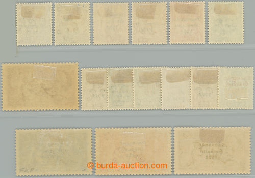 Philately. SG.1-9, Brit. George V. ½P - 10P with overprint; complete first set of 12 stamps incl. shades and color variants of overprint, in addition SG.4b with full overprint offset, minor faults, c.v.. ca. £127 (Image) (Image2)