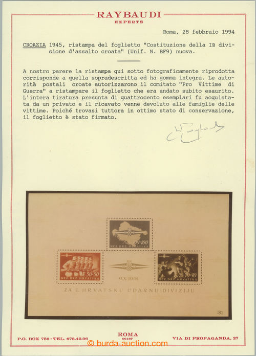 Philately. Unifil N.BF9, miniature sheet Sturmdivision, official issue of Croatian exile government For Vitime di Guerra, printing only 400 pcs, very fine, certificate Raybaudi (Image) (Image2)
