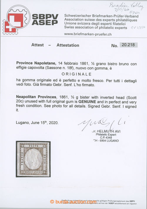 Philately. Sass.18f, Victor Emmanuel ½Gr brown, efigie capovolta - INVERTED MIDDLE; very fine, certificate Avi, exp. Senf, c.v.. 4.000EUR