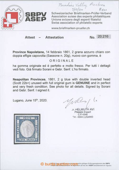 Philately. Sass.20g, Victor Emmanuel 2Gr blue, doppia efigie capovolta - INVERTED DOUBLE MIDDLE; very fine, certificate Avi, exp. Senf and Sorrani, c.v.. 1.800EUR (Image) (Image2)
