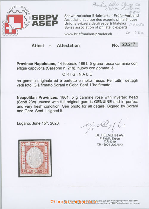 Philately. Sass.23c, Victor Emmanuel 5Gr red, efigie capovolta - INVERTED MIDDLE; very fine, certificate Avi, exp. Senf, Sorrani, c.v.. 3.250EUR