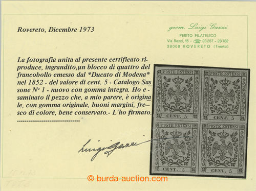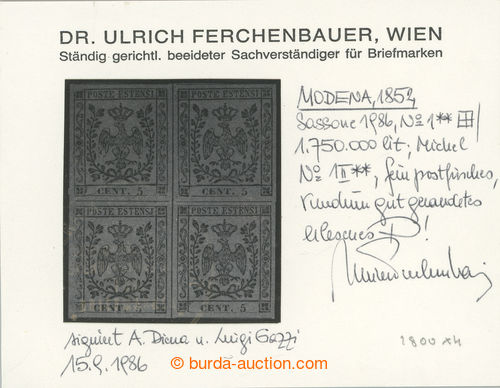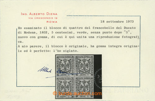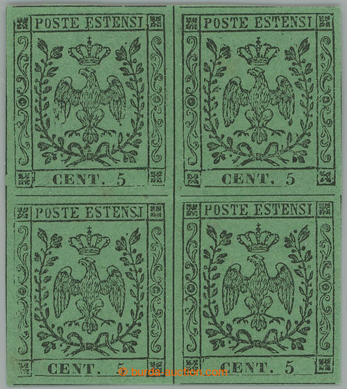 Philately. Sass.1, Coat of arms 5c green; very fine mint never hinged block of four (!) (gomma integra), wide margins; certificates A. Diena, L. Gazzi and Dr. Ferchenbauer, c.v.. 70.000EUR, important Italian rarity! (Image) (Image2)