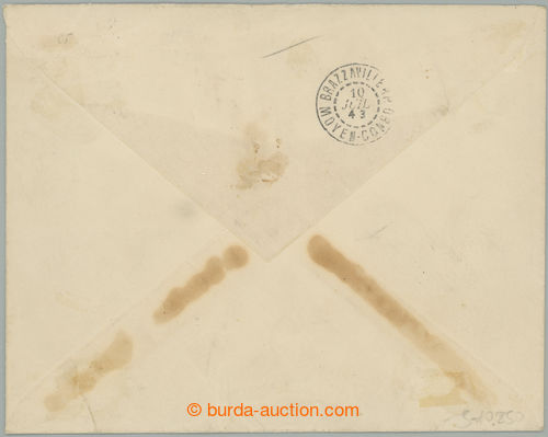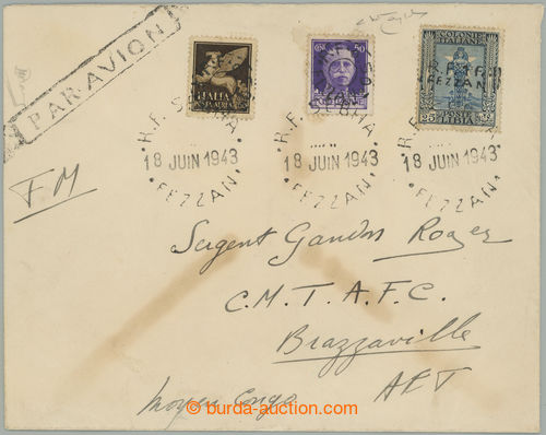Philately. French occupation Italian Fezzanu / airmail letter with Sass.11, 12 + airmail Aerea No.3, military post FM, cancel. H.F. SEBHA 18 JUIN 1943, to Brazzaville (Moyen Congo); exp. Raybaudi, c.v.. 10.800EUR, rare (Image) (Image2)