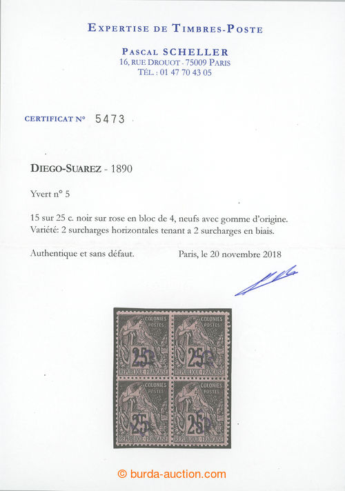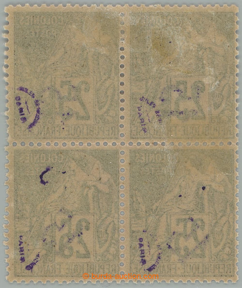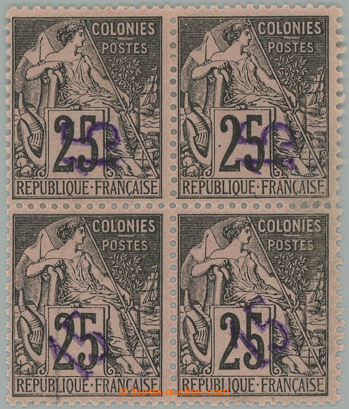Philately. Yv.5, overprint Allegory 15/25C as blk-of-4, upper pair with overprint vertical, the bottom crossways; very fine, certificate Scheller, rare (Image) (Image2)