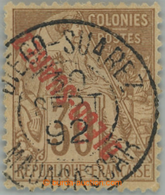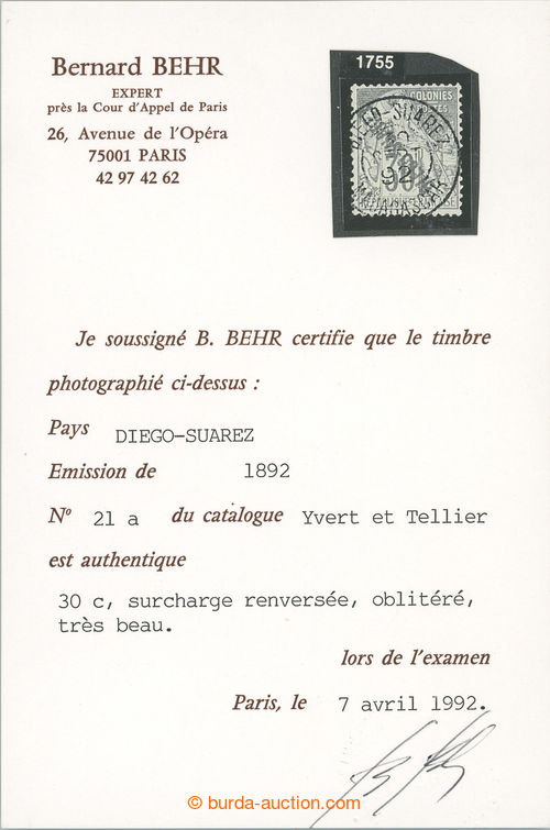 Philately. Yv.21a, overprint Allegory 30c with INVERTED red overprint DIEGO-SUAREZ; overall very fine, on reverse part of original background envelope, exp. Brunn, Scheller and certificate Behr tres beau, c.v.. 2.100EUR, rare
