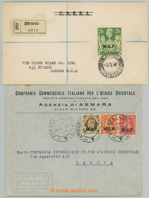 Philately. Brit. occupation / 2 letters, airmail and Reg - with stamps M.E.F. Sass.6, 7, 13 from Eritrea - ASMARA to Genoa and Sass.14 from RHODOS (!) to London; very fine, exact frankings, c.v.. 5.300EUR (Image) (Image2)