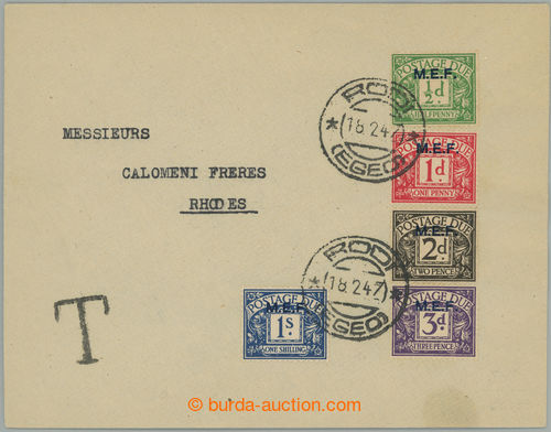 Philately. Brit. occupation / local letter T(axe) from RHODOS (!) with postage-due Sass.S1-S5, M.E.F. ½P-1Sh, cancel. RODI 18.2.47 / EGEO; very fine, c.v.. 15.000EUR (see. Sassone 2023 page. 1125) (Image) (Image2)