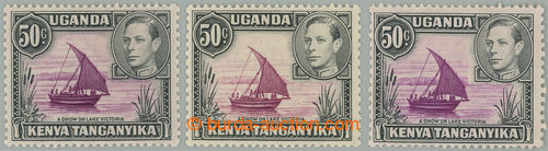 Philately. SG.144b, 144c, 144d, George VI. Dhow 50c, selection of 3 sought shades: Dull claret and black; Brown-purple and black; Reddish purple and black; c.v.. £300, missing in collections (Image) (Image2)