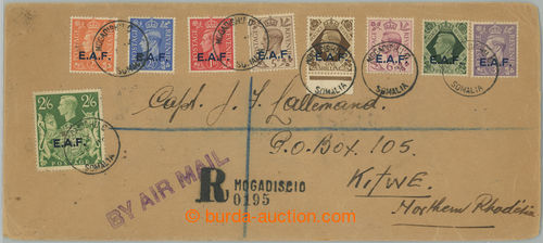 Philately. Brit. occupation / Reg letter with Sass.1-9 overprints EAF on George VI. 1P-2Sh6P, from Mogadishu to Nothern Rhodesia, cancel. MOGADISHU 22 JY/ SOMALIA; fine, c.v. 1.500EUR+ (Image) (Image2)