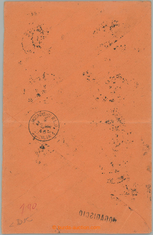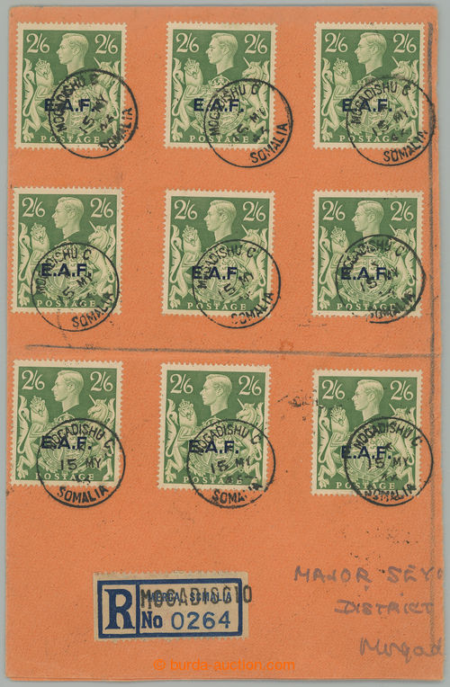 Philately. Brit. occupation / half of Reg letter franked with 9x Sass.9, overprints EAF on stamps George VI. 2Sh6P, cancel. MOGADISHU 15 MY/ SOMALIA; c.v.. for complete letter 27.000EUR (!), interesting (Image) (Image2)