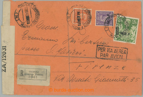 Philately. Brit. occupation / Reg and airmail censored letter, with M.E.F. Sass.7, 9, 14, sent from Tripoli to Florence; sound condition, c.v.. 1.660EUR (Image) (Image2)