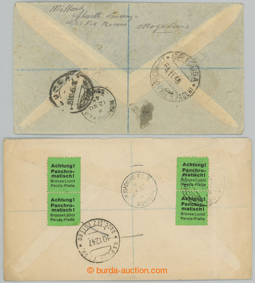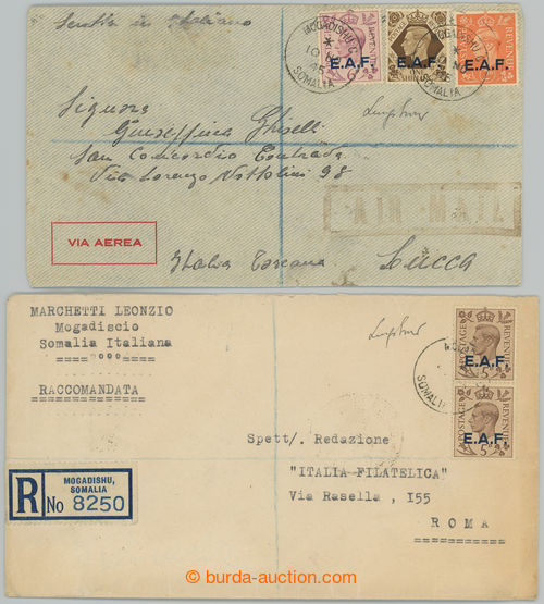 Philately. Brit. occupation/ 2 letters, airmail and Reg with stamps E.A.F. Sass.5(2x), resp. Sass.2, 6, 8, both with cancel. MOGADISHU sent to Italy; very fine, c.v.. 800EUR (Image) (Image2)
