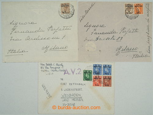 Philately. Brit. occupation/ 3 letters with stamps B.M.A and B.A. TRIPOLITANIA Sass.1, 7, resp. 20, resp. 14, 15, 16, 18 (2x), all from TRIPOLISU sent to Italy and Germany (US zone); very fine, c.v.. 1.150EUR, rare! (Image) (Image2)